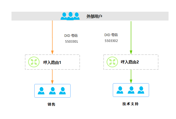 如果你希望 PBX 可以根据不同的 DID 号码,引导来电到不同的呼入目的地,你需要添加两条呼入路由并设置不同的 DID 匹配模式和呼入目的地。